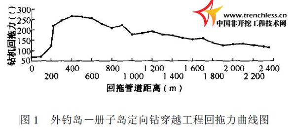 回拖易造成管道損壞 外釣島 冊子島海底管道定向鉆穿越曲線長度達2 350 m, 如此長距離的管道回拖, 在國內外穿越史上尚無先例。主要存在的問題是, 回拖時, 管道長度很長, 自身的重量較大, 管道與孔壁之間的摩阻增大, 所需的推力很大2%, 回拖過程易造成管道損壞。同時, 鉆機基礎可能出現滑移、失穩等現象。