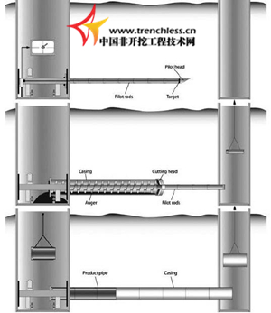 最后一個步驟是工作管的頂進,工作管與套管的外徑接近相等,通過鉆機頂進安裝,同時螺旋鉆頭和套管將頂入接收坑。在接收坑里螺旋鉆頭和套管被拆除并提升。重復這個過程直到所有的螺旋鉆頭和套管被工作管替換。這種方法被用于導向住宅支管連接,同樣可以用于長度100m 以內,直徑300mm以內的管道鋪設。